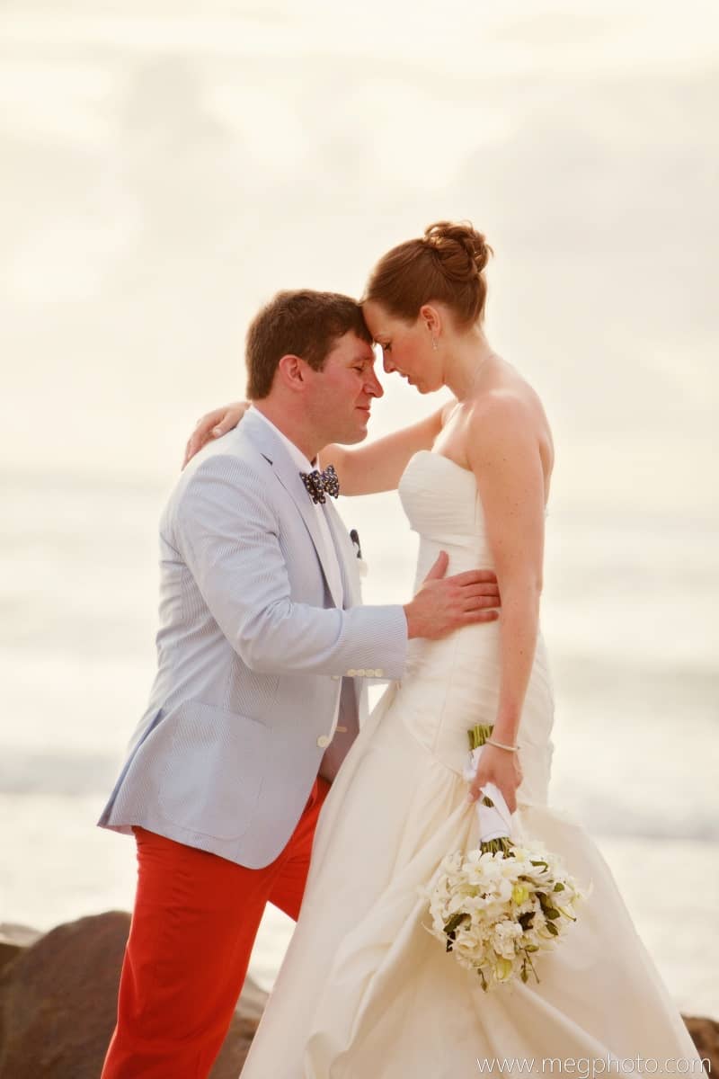 Stacie and Dan created a photograph station for their guests at the reception. They hung wedding pictures of their parents, grandparents and siblings and set out cameras so that guests could snap pictures to capture special moments. The couple also catered to their guests by presenting them with beach bags in their hotel rooms− complete with sandals, sunscreen, local snacks, and itineraries.