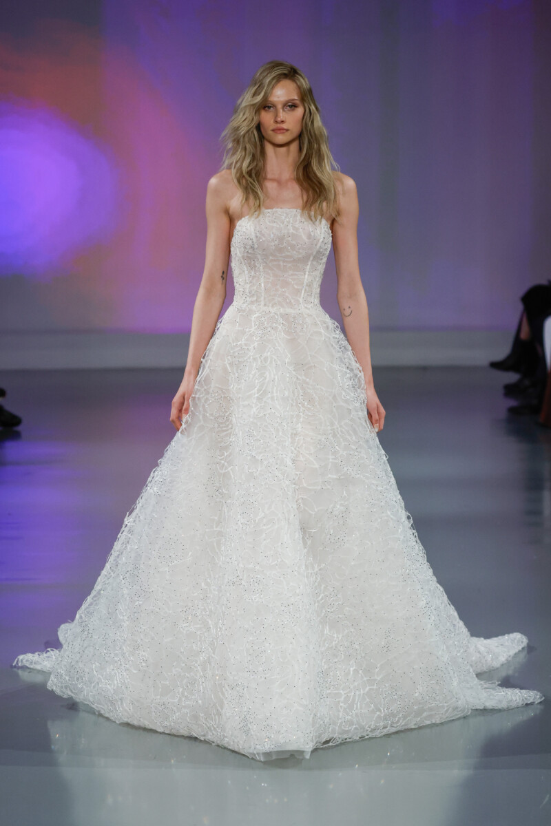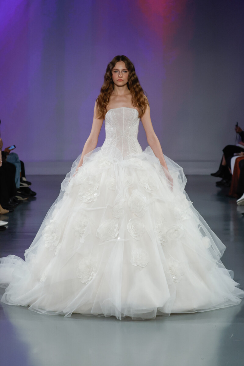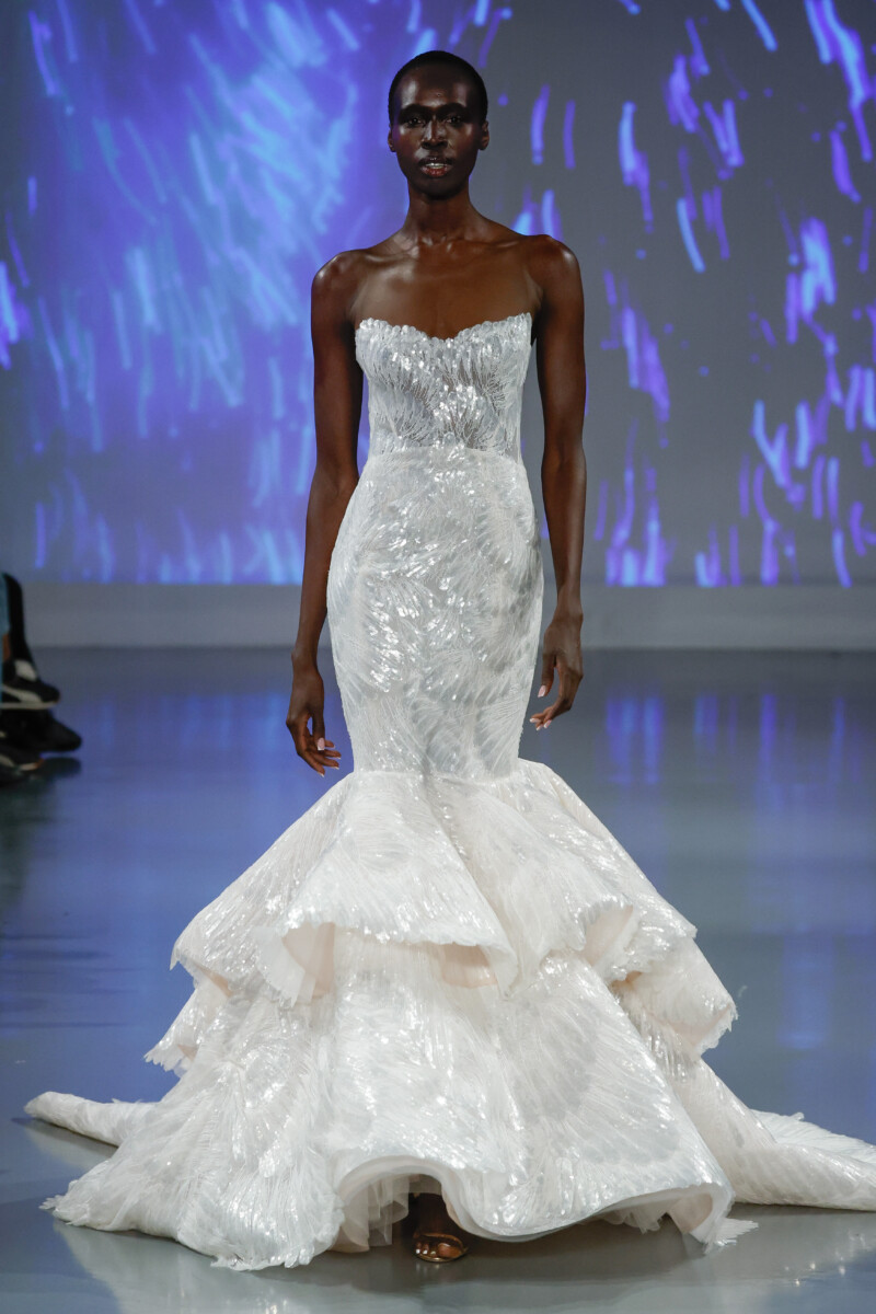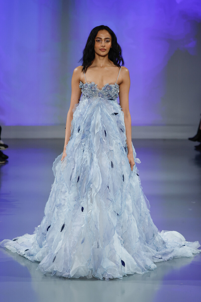 “In this digital age of algorithms, AI, and an abundance of screens, I wanted to explore the expression of my imagination and the very essential human aspect of creativity amplified by modern technology, blending the two worlds as seamlessly as possible. It was our goal to use technology as a tool to enhance the viewers’ experience, so we designed an immersive environment utilizing projection mapping to showcase our collection of gowns that celebrate heritage craft and construction.