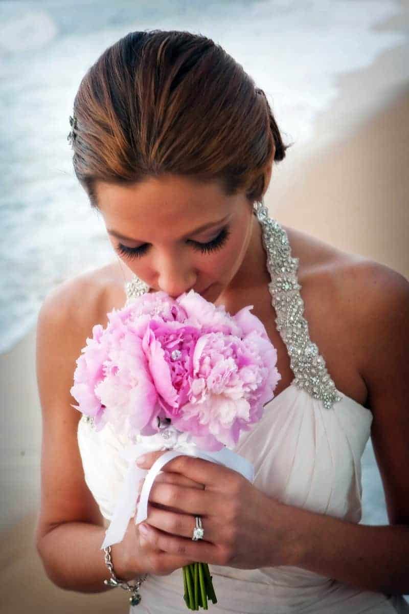 Since Cameron was unable to find a photo booth for rental in Puerto Rico, she purchased a mini Polaroid camera guests used to take pictures and place in the guestbook along with a message. The pictures were about the size of a credit card and the guests enjoyed shooting photos for both the book and to keep. For their friends who love to party, the reception featured an ice luge-shaped martini glass with frozen lime slices that guests could use to pour shots of alcohol through it into their glass. Wedding favours were wine corks that featured silver starfish on top since both the bride and groom love wine.