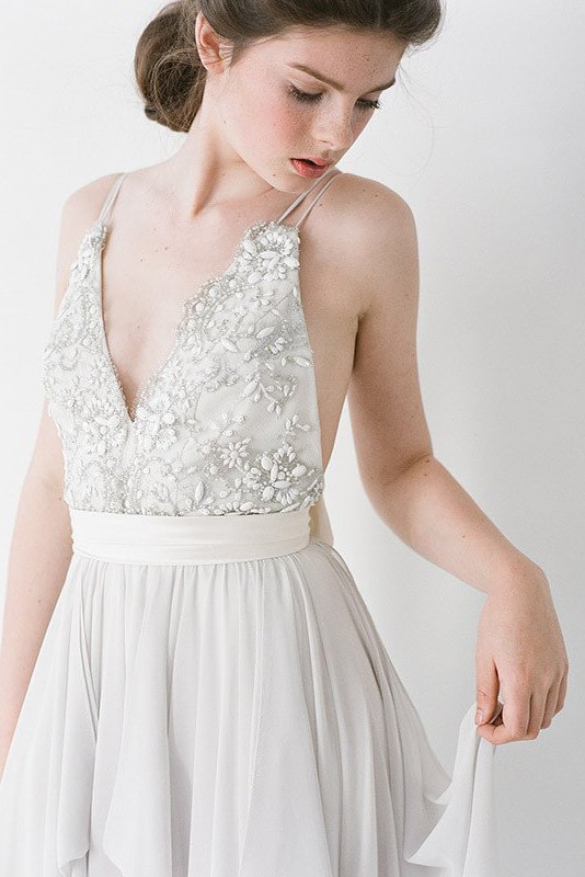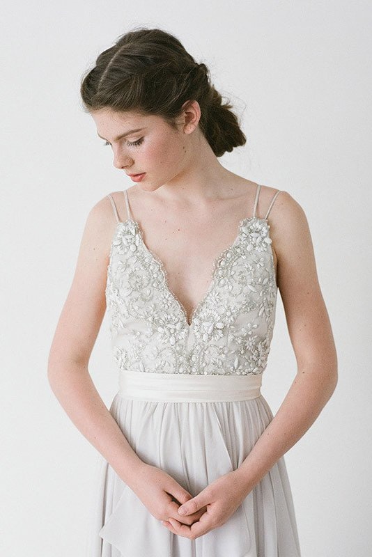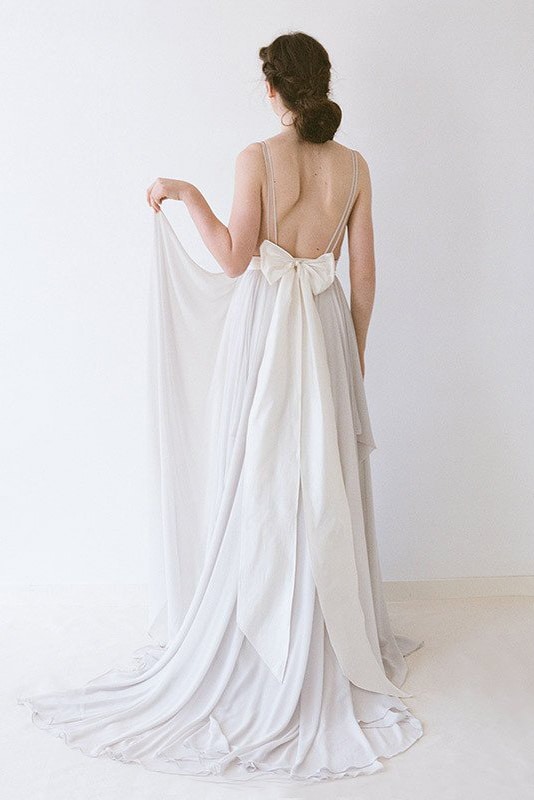 This gown features a plunging neckline, open sides, and a striking back. The skirt is constructed with 10 yards of hand-draped chiffon, which catches movement and the wind perfectly. The bodice showcases hand-sewn Spanish lace and refined double straps. With its refreshing colour palette and unique fabrication, Alexandra is perfect for a cloudy day at the beach or a winter wedding. This gown is tied together beautifully with a silk bow that is both elegant and dramatic.