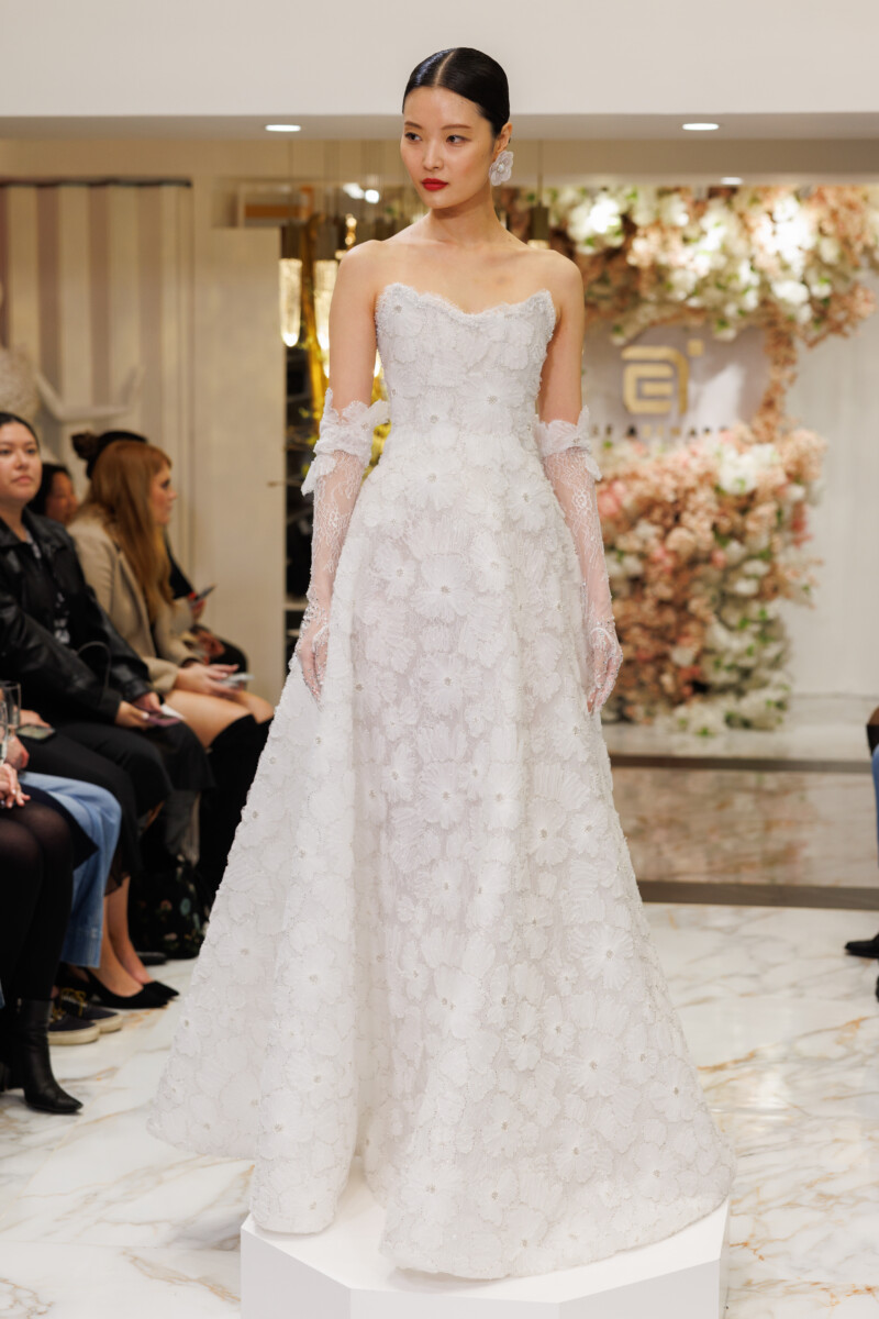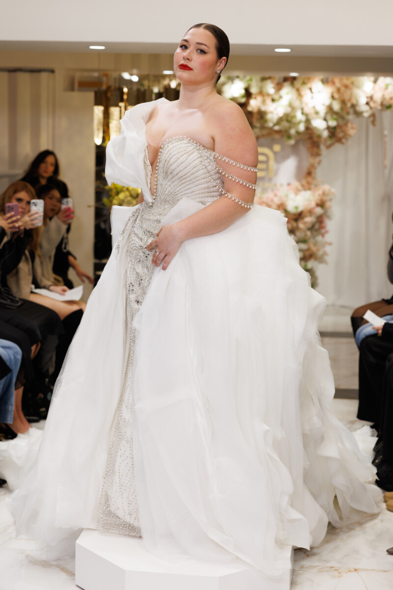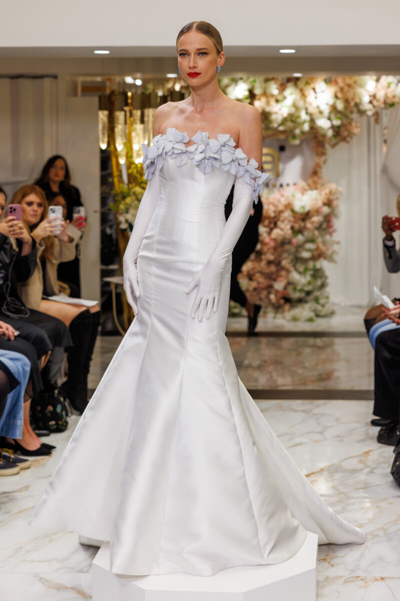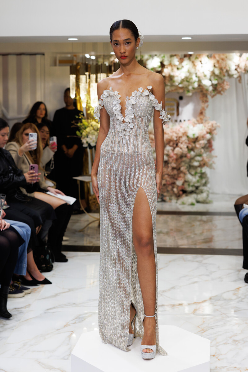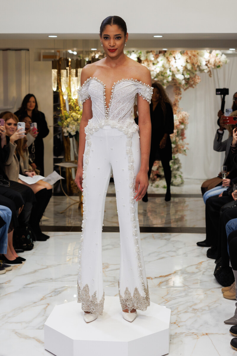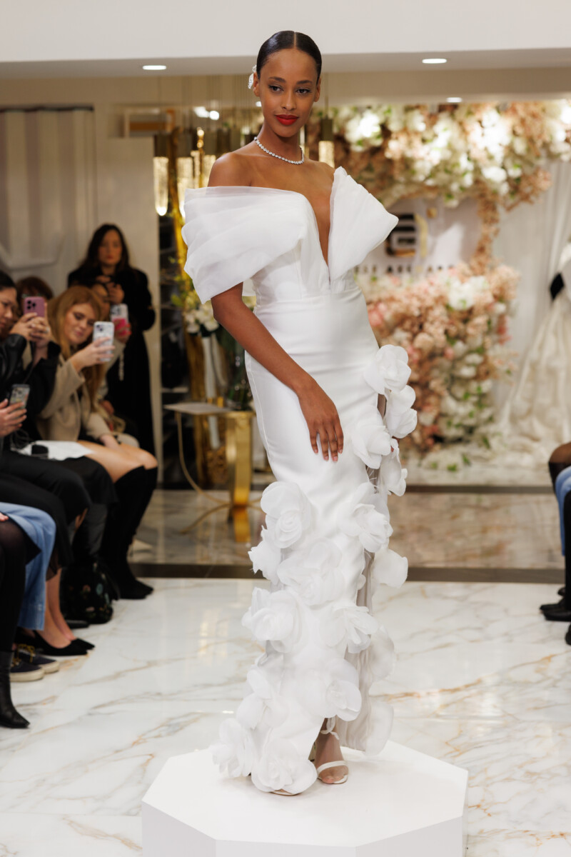 “This collection is titled ‘In Bloom’ as a continuation of my ‘In Blossom’ collection. It’s inspired by the Magnolia Grandiflora and touches on the phases of a flower as it transforms; highlighting the ability to wear the majority of the garments in numerous ways. ‘In Bloom’ showcases my appreciation for pearls, delicate floral appliqués, and signature Swarovski crystal patterns.” —Esé Azénabor