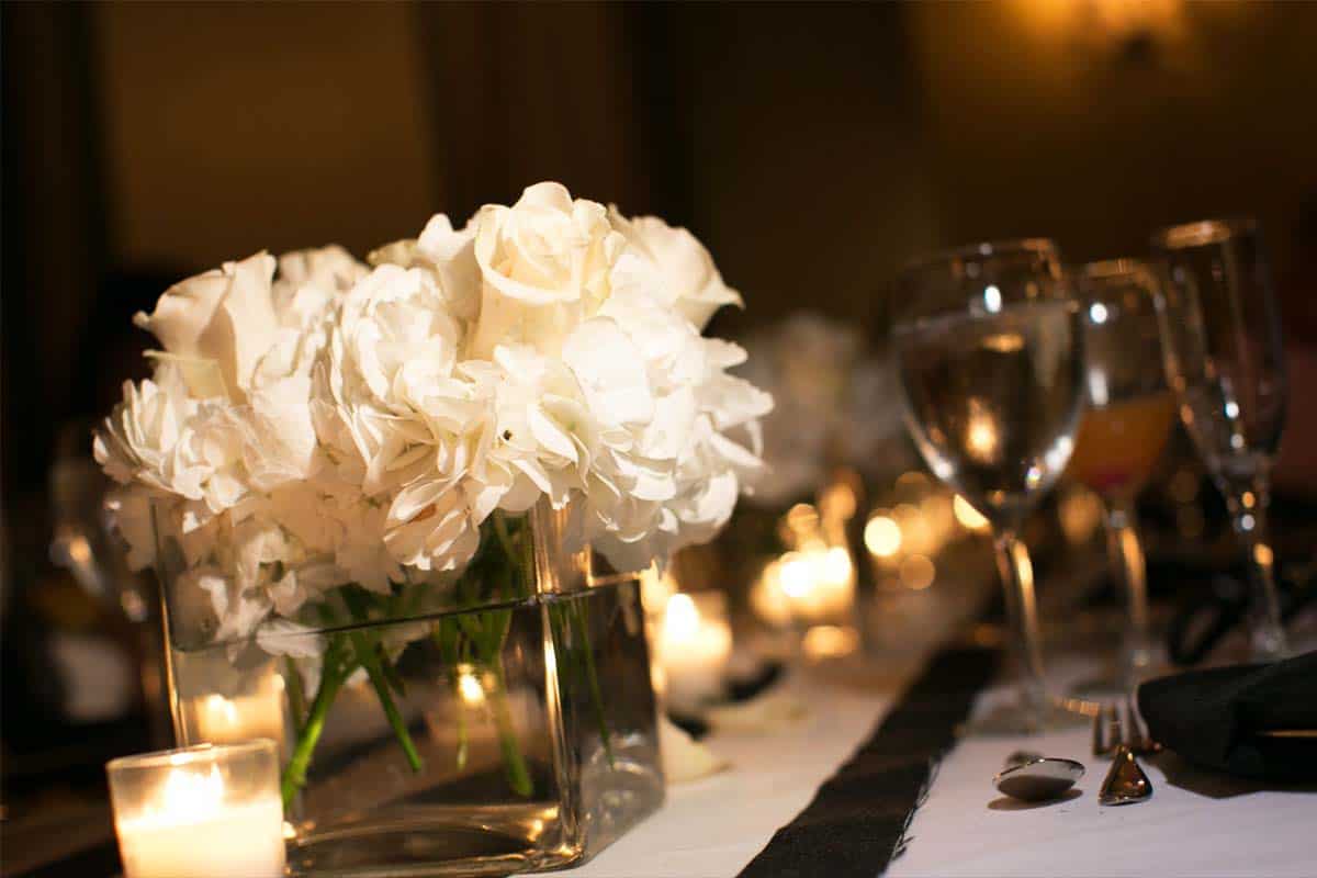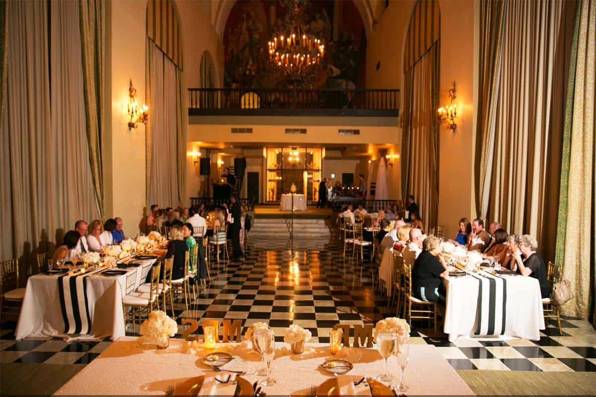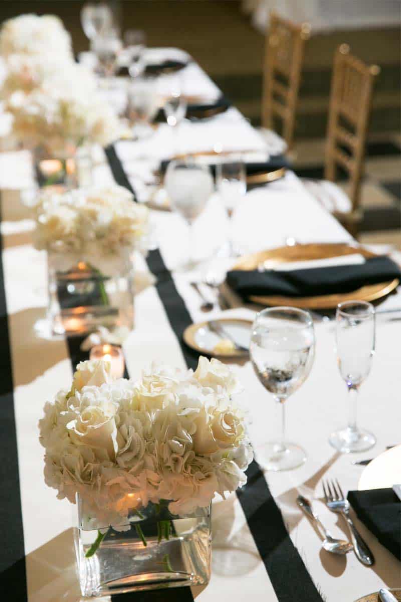 The city of Old San Juan is full of romance. When the couple first saw El Convento for the first time, they knew this was the place where they wanted to host an elegant wedding surrounded by old world beauty. The Campeche room looked like it belonged in the Great Gatsby movie with its marble black and white checked out floor. With this influence the couple decided to go with a black, white and gold colour scheme for the wedding.