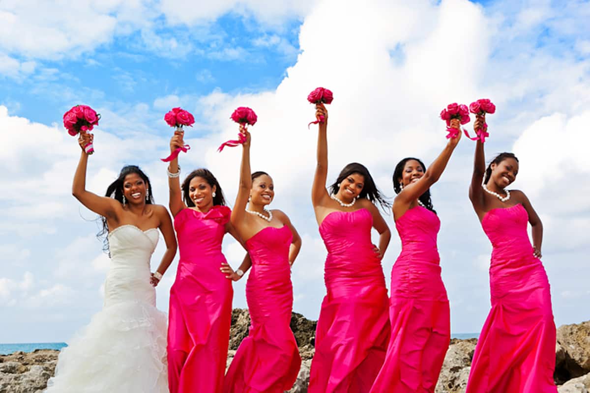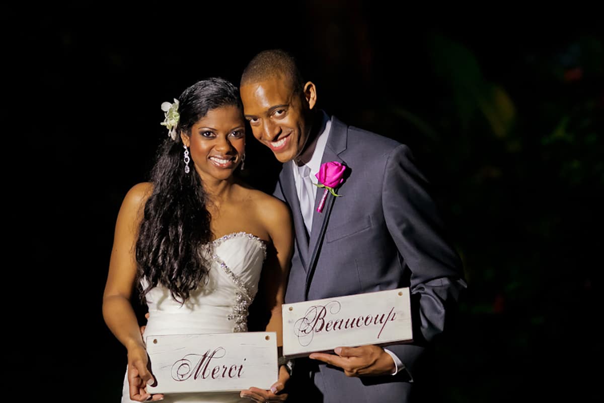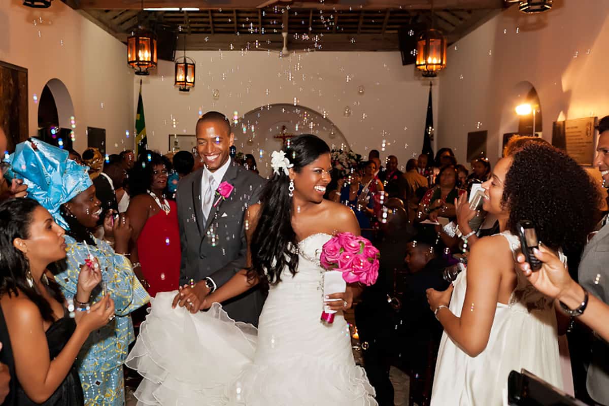 The ceremony began with the thrilling sounds of the South African song Mbube Wimoweh by Ladysmith Black Mambazo. The bridesmaids entered the chapel wearing fuchsia dresses by Mori Lee paired with shoes by Brian Atwood. The groomsmen who accompanied them up the aisle were attired in Vera Wang suits. The sounds of I Can’t Help (Falling in Love With You) by UB40 heralded the arrival of the bride, who stunned in a mermaid gown with a beaded bodice created by Mori Lee and make-up by Loni Jones. Her father Michael Lake, financial controller of Couples Resorts, escorted her up the aisle to meet her nervous groom Olivier, who was smartly clad in a Vera Wang gown. The ceremony, which was officiated by Canon Glen Prince, came to a close with an exhilarating African drum performance by Zooco Performing Arts Drummers from Ocho Rios.