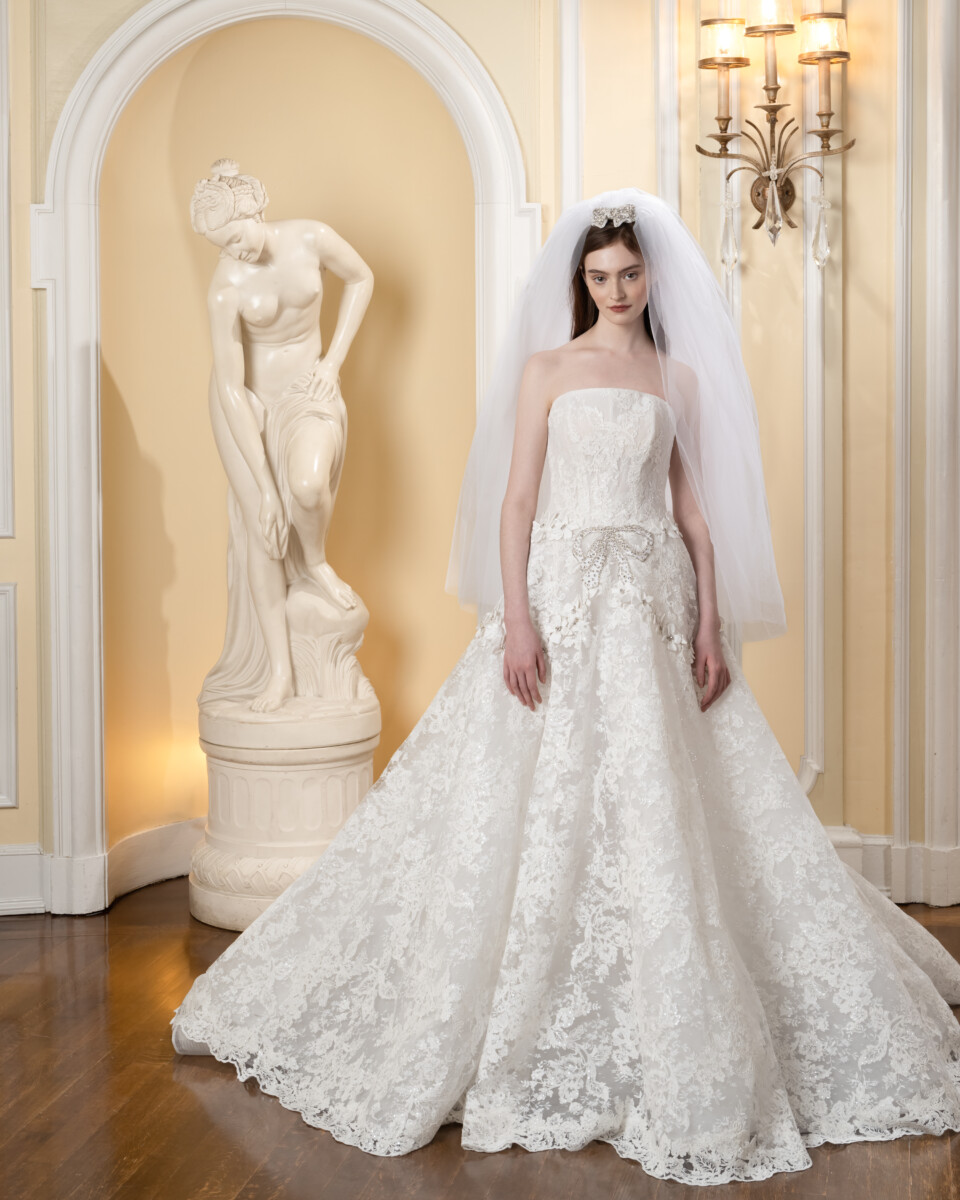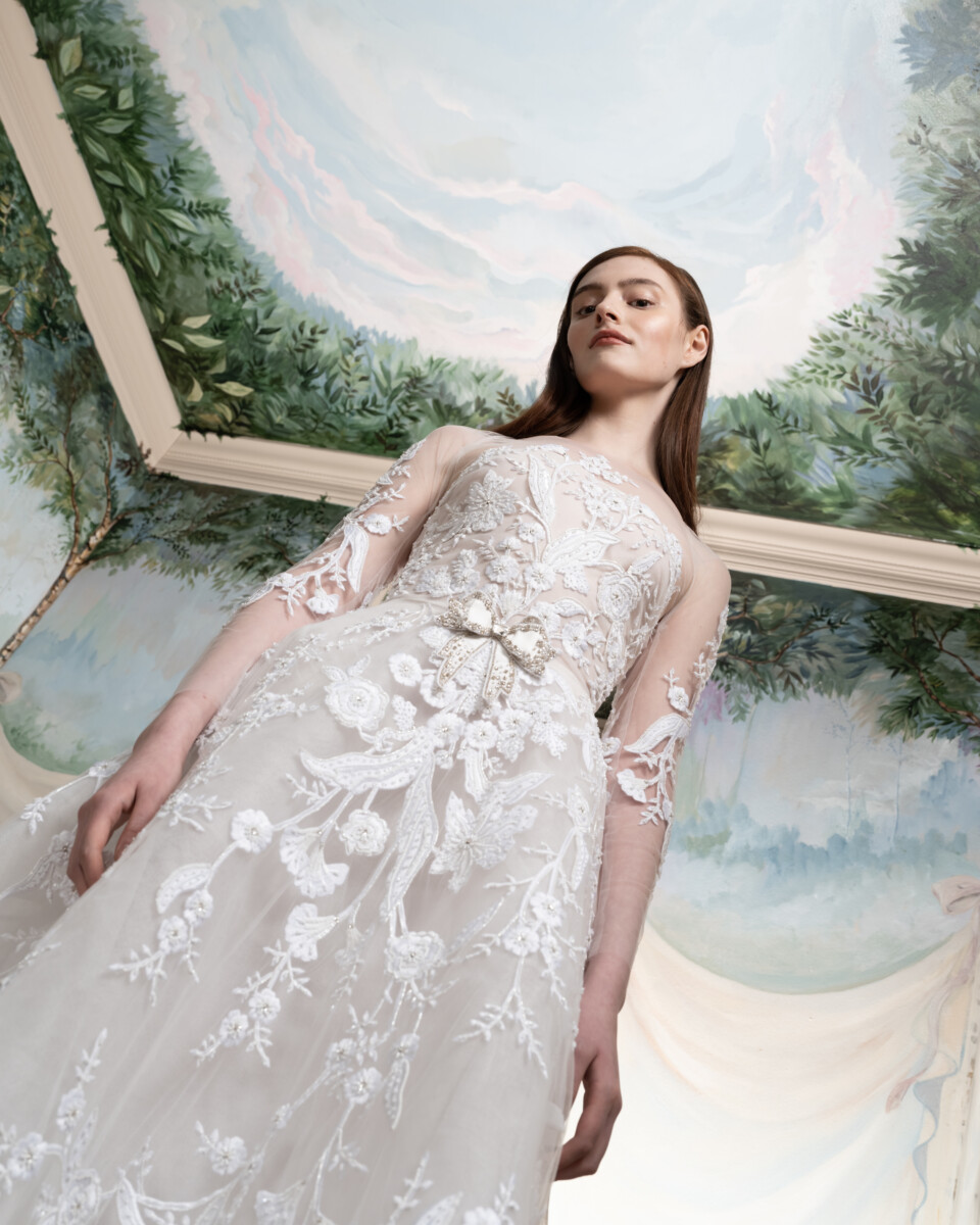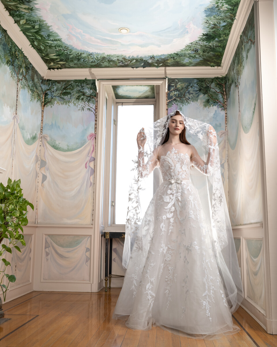 For Spring 2025, the Reem Acra bride is a vision in a blossoming garden. Delicate, rich embroideries, a brand signature, trail down dresses and evaporate like the fragrance of springtime flowers in bloom.