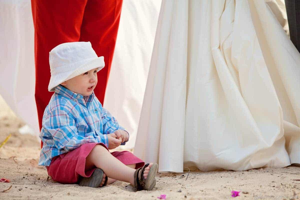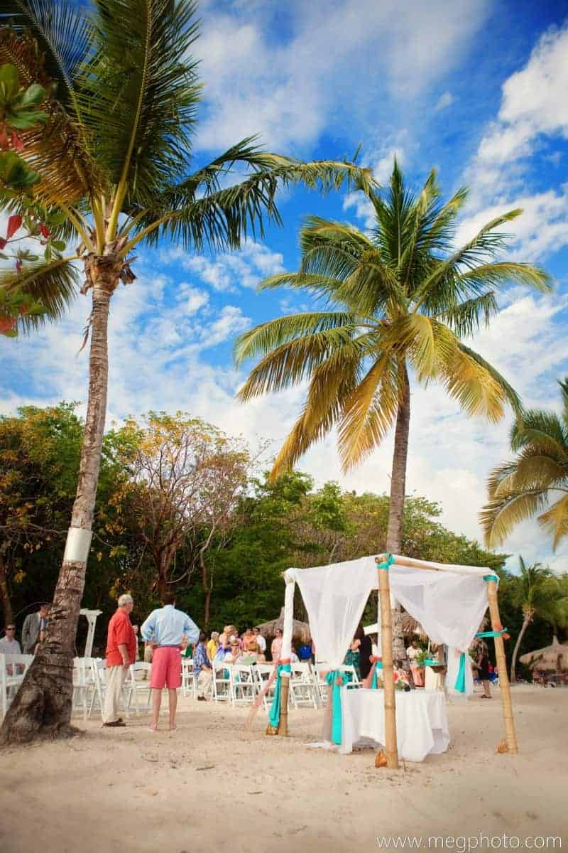 Stacie and Dan created a photograph station for their guests at the reception. They hung wedding pictures of their parents, grandparents and siblings and set out cameras so that guests could snap pictures to capture special moments. The couple also catered to their guests by presenting them with beach bags in their hotel rooms− complete with sandals, sunscreen, local snacks, and itineraries.